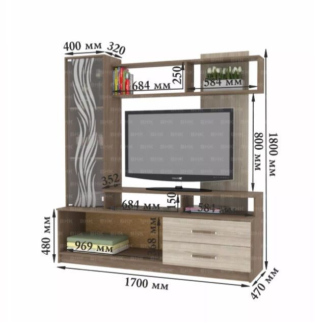 Гостиная Дарья – это компактная стенка, которая ничем не уступает по вместительности большим гарнитурам. На стеклянном фасаде стеллажа нанесен интересный волнообразный орнамент. ТВ-тумба включает в себя одну большую секцию, в которой легко поместятся все необходимые для тв зоны атрибуты. Вместительный шкаф с перегородкой. Одна секция шкафа представляет собой отдел с полками, а во второй расположена выдвижная штанга под одежду.
