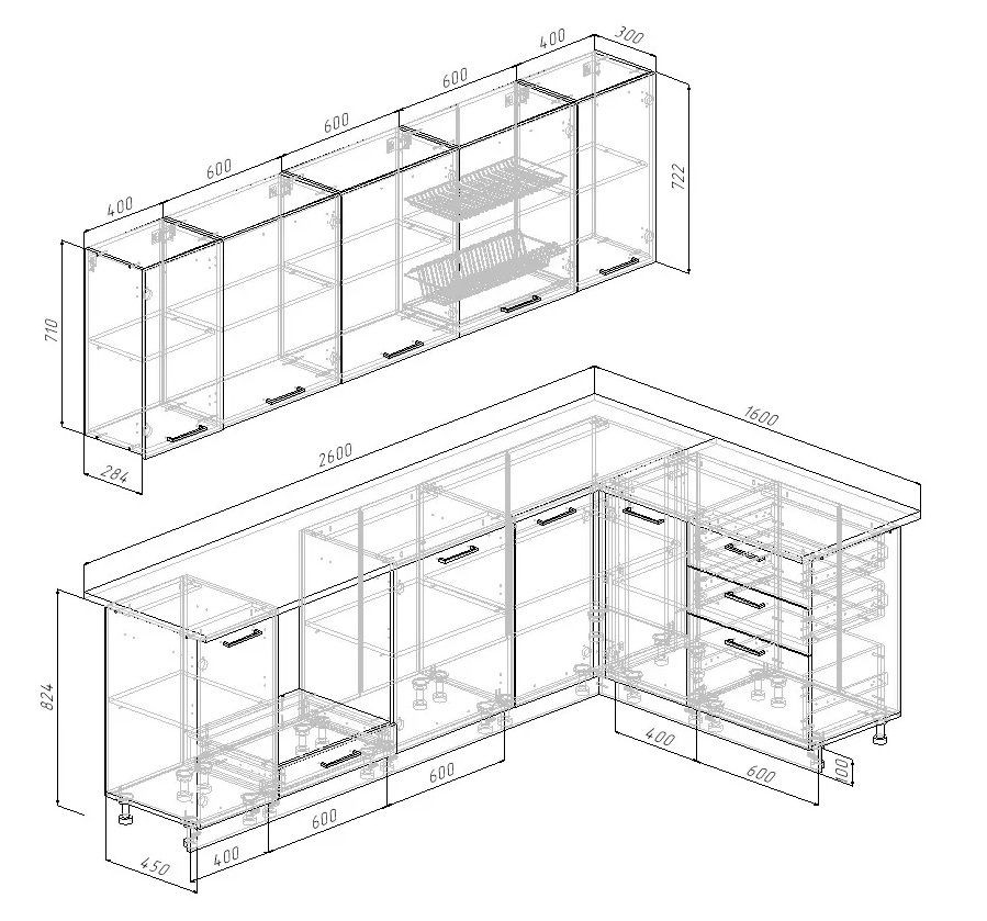 Кухонный гарнитур угловой Трансильвания 2600х1600 мм (Стол. 26 мм)